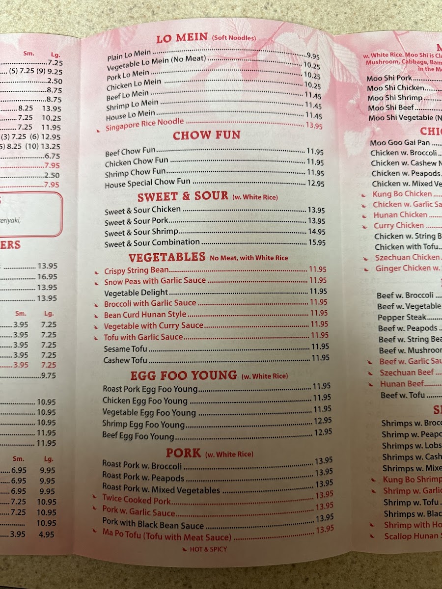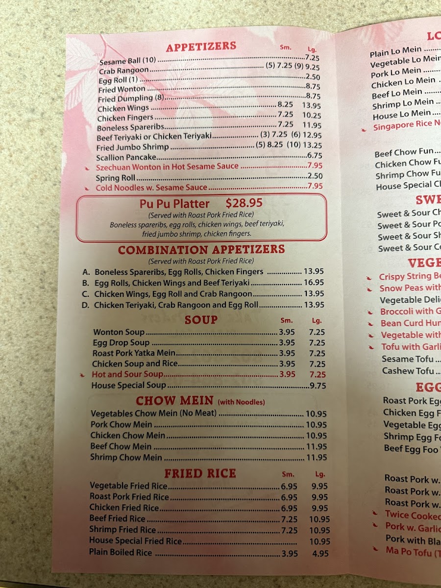 The menu features comforting soups like wonton soup and egg drop soup, which provide a warm start or a light companion to a meal. Their fried rice options, such as jumbo shrimp or Hawaiian fried rice, fit perfectly for a filling lunch or an easy dinner. For noodle lovers, there’s a versatile choice between chow fun or mei fun with various proteins or vegetables, as well as the slightly more spiced Singapore chow mei fun.